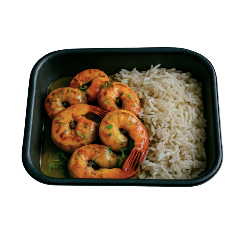 Camarones en salsa de ajo y perejil, cocidos a la perfección y acompañados de arroz basmati.