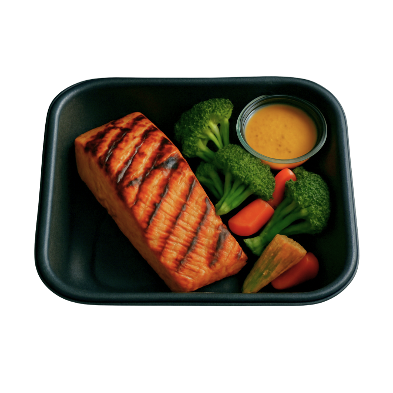 Salmón fresco a la parrilla, servido con una salsa de mostaza y miel, acompañado de vegetales al vapor.