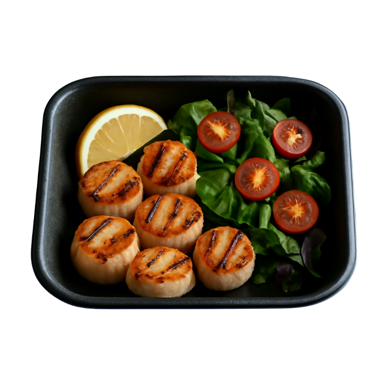 Deliciosas vieiras a la plancha, acompañadas de un toque de limón y una guarnición de ensalada fresca.